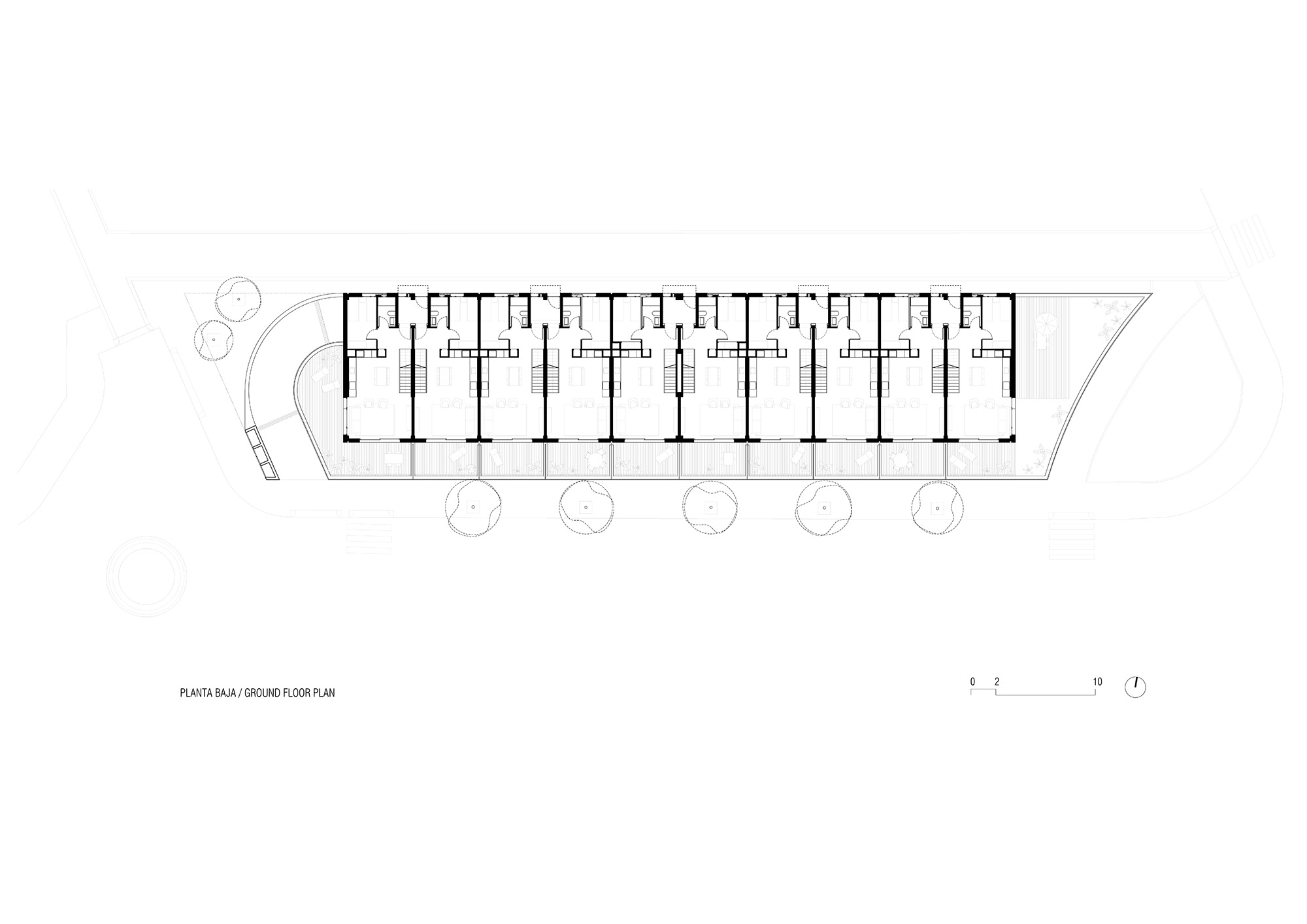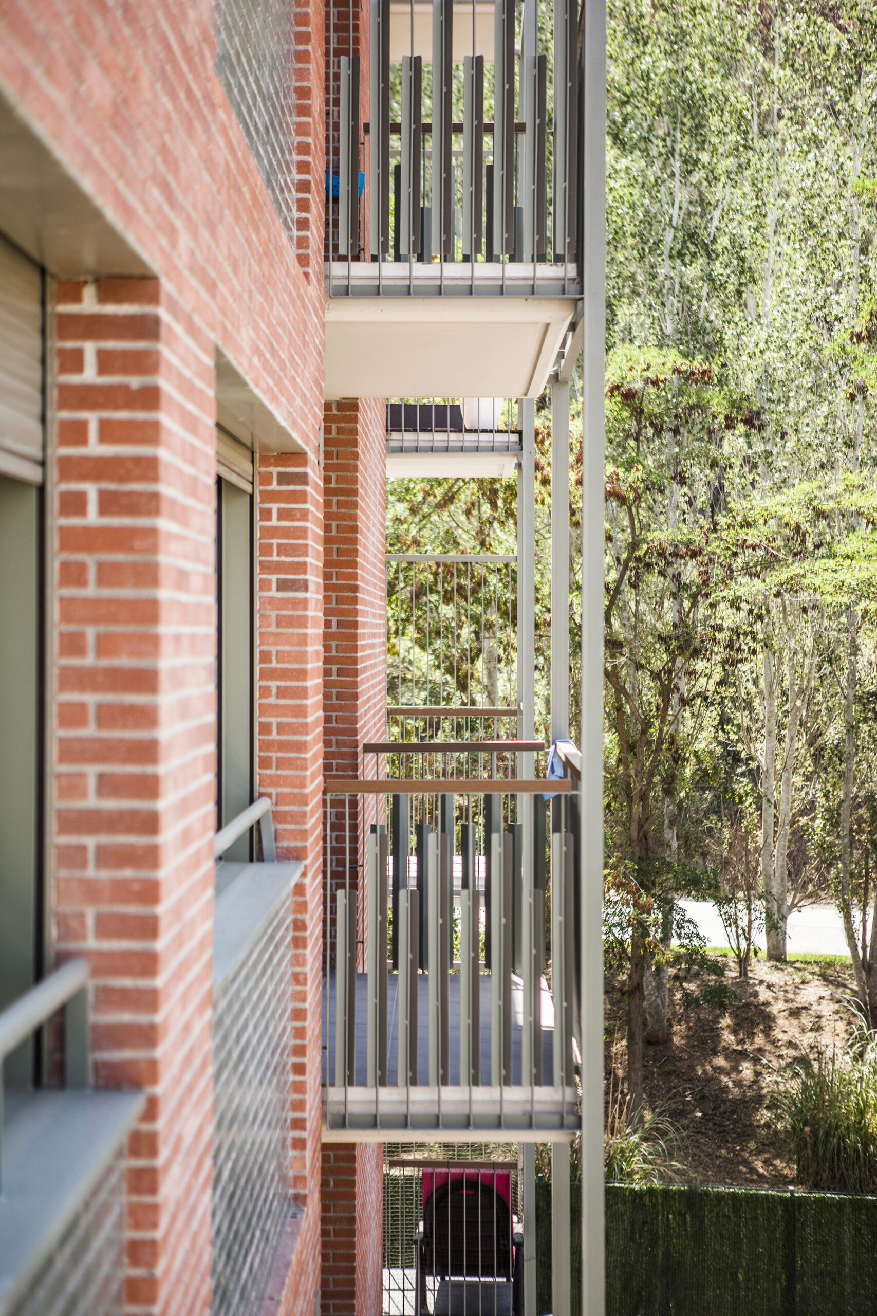 As an example, the semi-detached dwellings express their relationship with the context through lintelled openings and ceramic lattice screens that mediate between interior and exterior. In the freestanding residential blocks, the materiality of brick is complemented by the lightness of green-toned railings, in dialogue with the adjacent Coastal Range. In the linear block facing the main avenue, the brickwork generates textures at ground level to define a plinth that continues the language of the neighbouring façades.