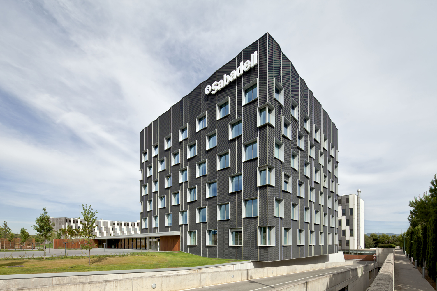 La nueva sede central y centro de servicios del Banco de Sabadell se plantea como transformación y ampliación del complejo de oficinas Landscape que proyectamos y construimos para el Banco en 2003. El edificio existente consta de una barra longitudinal de oficinas que sigue la geometría del solar a lo largo de la autopista B-30 y una nave industrial destinada a archivo en la parte posterior, conectada a las oficinas mediante cuatro puentes elevados con respecto a la planta de acceso al edificio