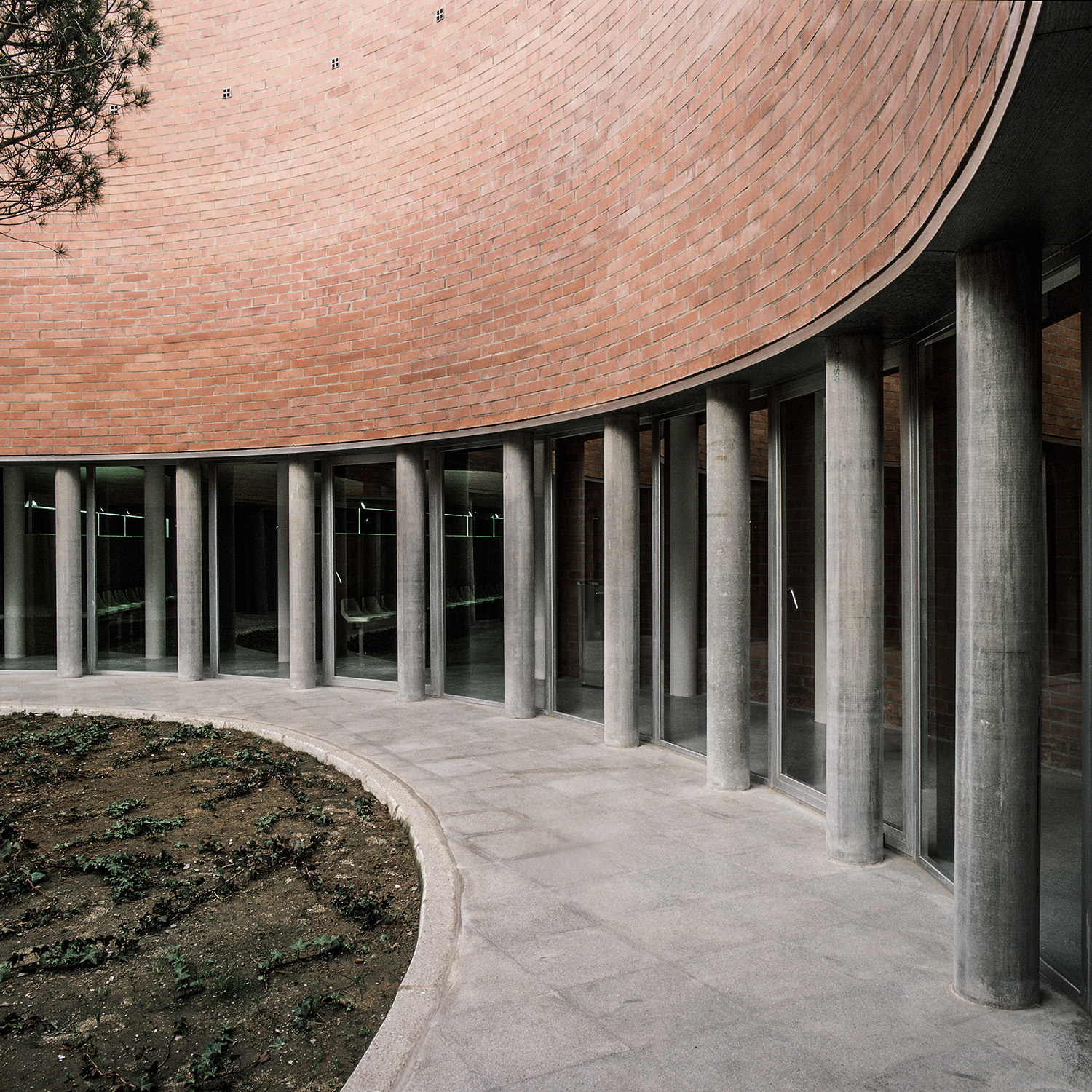 The plan is solved with a circular patio that contains a generous tree, like a vegetable dome, in its center. Around it are the areas of circulation and waiting for patients. The offices are housed in the perimeter, protected from direct view from the street by a patio.